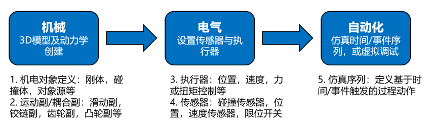MCD創建的機電集成的功能模型不僅可用于機電系統的功能驗證,同時也是組成虛擬調試關鍵環節,本文將介紹使用MCD創建機電集成功能模型的流程,如下所示: