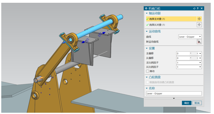 基本運動副只定義一個運動約束,耦合副則是對兩個具有約束關系的運動副進行定義,兩者之間具有主從關系。主要有齒輪副,機械/電子凸輪,滑輪與帶,齒輪齒條等,如下所示。