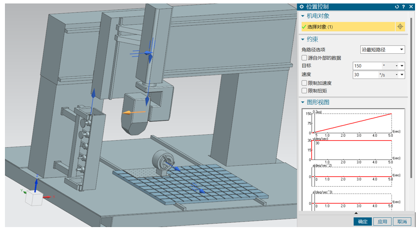 機電系統的運動副與約束定義完成后,可以添加執行器以驅動運動副。MCD中可用的執行器包括速度控制,位置控制,力與扭矩控制,氣動/液壓控制,反算機構驅動,傳輸面等功能。其中反算機構驅動可用于工業機器人的運動設計,實現對機器人的虛擬示教。