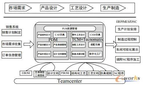 PLM系統工程設計采用西門子的Teamcenter系統,進行產品數據、設計模板的規范化定義實現三維模型的全壽命周期的管理。Teamcenter中所有設計數據和工藝數據保證了單一數據源,直接使用產品設計的數據進行工藝設計,實現與產品設計和制造資源關聯的數據結構。針對產品設計、工藝業務需求提出PLM系統建設方案,通過對產品、資源和工廠的數據集成管理,實現產品從設計到制造的全過程信息支持。PLM系統總體設計方案如下圖所示。
