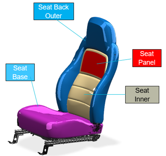 要創建外觀方案,必須先將幾何體直觀地分割為多個區域,然后為每個區域指派不同的材料和紋理。 這些創建的區域即是外觀指示符。指派給外觀指示符的幾何體是用戶要更改其外觀的幾何體,以便用戶可以比較模型的外觀。當用戶將材料或紋理指派給外觀指示符時,NX 不會將材料或紋理與零件保存在一起,而是僅在外觀方案文件中保存材料或紋理的名稱。 加載外觀方案時,NX 在庫文件夾和紋理文件夾可視化首選項中指定的選項中搜索材料和紋理。下圖表達了一個產品的外觀結構,在NX外觀管理模塊中,將此產品產品外觀拆分(Product Appearance Breakdown) - 表示產品外觀是如何進行組織的,通常與工程BOM不同1.座椅底座(Seat Base)